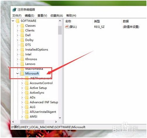 - 2打开注册表编辑器之后,我们双击左侧的目录,依次打开HKEY_LOCAL_MACHINE\SOFTWARE\Microsoft目录,如下图所示。