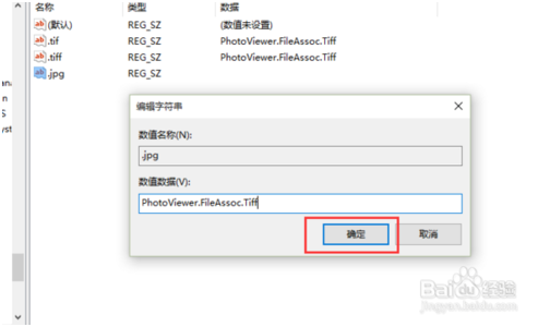 - 5接下来就是比较关键的步骤了,如果你想要打开.jpg后缀的文件,那么数值名称要写为.jpg,数值数据写为“PhotoViewer.FileAssoc.Tiff”,如下图所示,然后点击“确定”按钮。