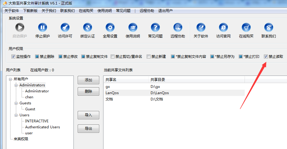 可以通过大势至共享文件审计系统设置直接禁止读取共享文件,则就会对没有权限访问共享文件的用户隐藏共享文件夹,从而进一步保护了共享文件的安全,如下图所示: