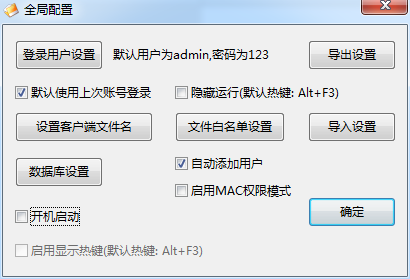 可以设置开机自动运行大势至共享文件监控软件,可以设置隐藏运行、设置自动运行,并且可以设置登录用户、数据库设置,并且还可以以访问共享文件的电脑MAC地址来设置访问共享文件的权限,从而实现灵活的共享文件访问权限设置。如下图所示: