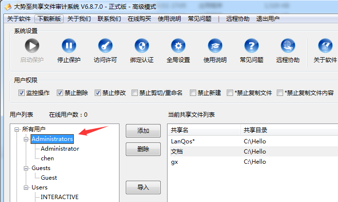 启动保护后,在左侧选择相应的共享文件夹,然后右侧自动会出现服务器当前所有用户,然后选择相应的用户,然后顶部的共享文件访问权限的功能即可激活,勾选即可。如下图所示: