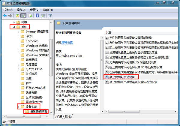 2.从本地组策略编辑器的左边栏目中依次进入“计算机配置” — “管理模块” — “系统” — “设备安装” — “设备安装限制”,双击右边栏目的“禁止安装可移动设备”选项