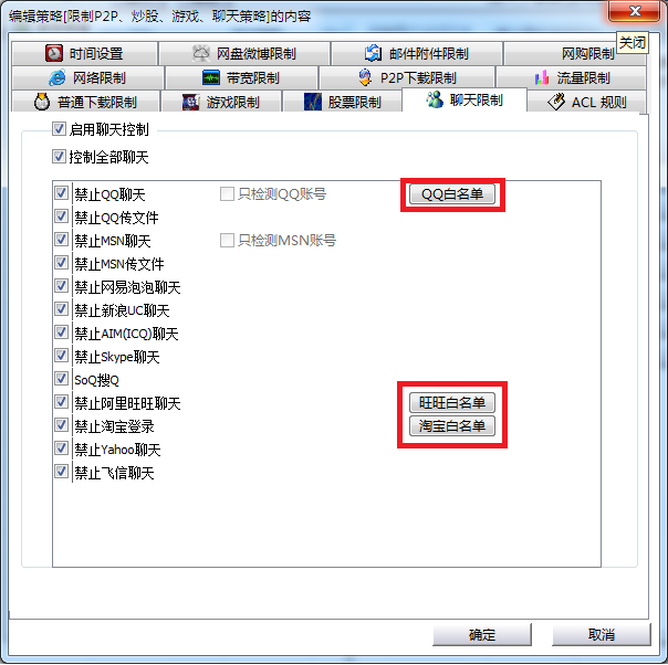 如果你的路由器无法实现上网行为管控功能,则你也可以通过部署一些网络行为控制软件来实现。例如有一款“聚生网管”软件(下载地址:http://www.grablan.com/wangguan.html),只需要在局域网一台电脑安装部署,就可以控制局域网其他电脑上网行为,有效禁止网购、阿里旺旺聊天等行为。如下图所示: