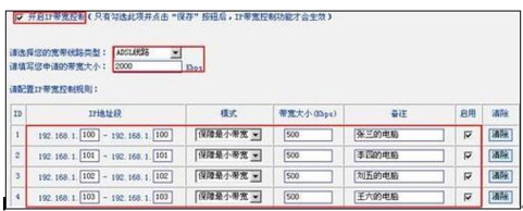 现在企业级的路由器、带网管功能的交换机大都提供了局域网流量监控、局域网带宽分配功能,只需要登录路由器进行相应的设置即可,操作也比较简单。登录路由器后,找到“IP带宽限制”(不同路由器名称不同),然后在里面勾选“开启IP带宽控制”,然后这里既可以限制总出口带宽的大小,还可以为局域网电脑进行IP带宽限制,只需要输入要限制的上行带宽和下行带宽值就可以了。如下图所示: