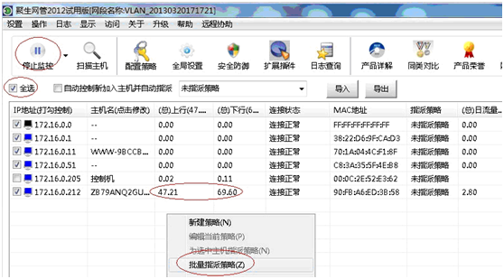 由于通过路由器限制网速有较为明显的局限,因此很多单位都是通过一些专门的带宽分配软件、局域网网络监测软件来实现局域网网速控制和局域网带宽分配。例如有一款“聚生网管”(下载地址:http://www.grablan.com/20_2.html)局域网网速控制软件,只需要在局域网一台电脑安装,就可以扫描到局域网所有电脑,并可以实时限制局域网各个电脑的带宽。如下图所示: