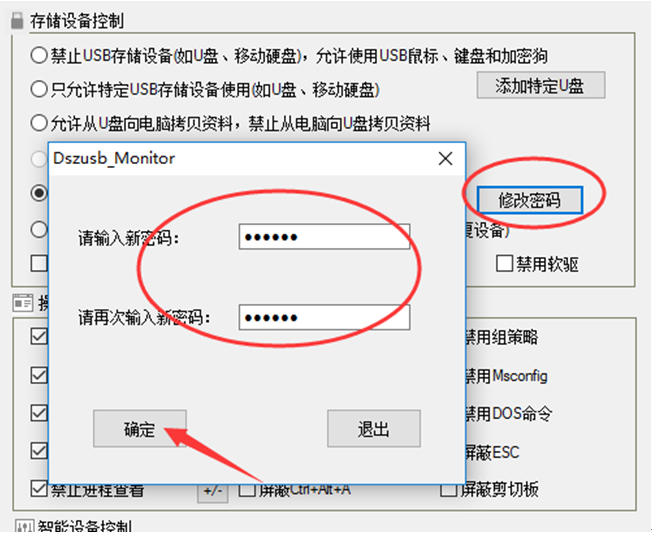 1、安装大势至USB管理软件。去大势至软件官网下载较新的安装程序(免费下载:http://www.grablan.com/download/dszusb.rar),安装非常简单,只需要5秒钟,按照页面提示,点两个下一步就可以了。安装完毕后,按住快捷键(alt+f2),输入密码,进入软件界面,勾选“可以从电脑向U盘拷贝资料,但必须输入密码”,同时点一下“修改密码”,如下图所示: