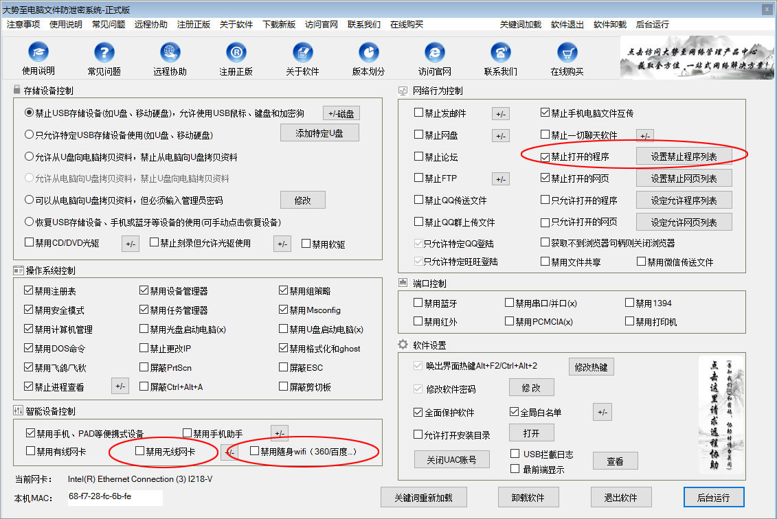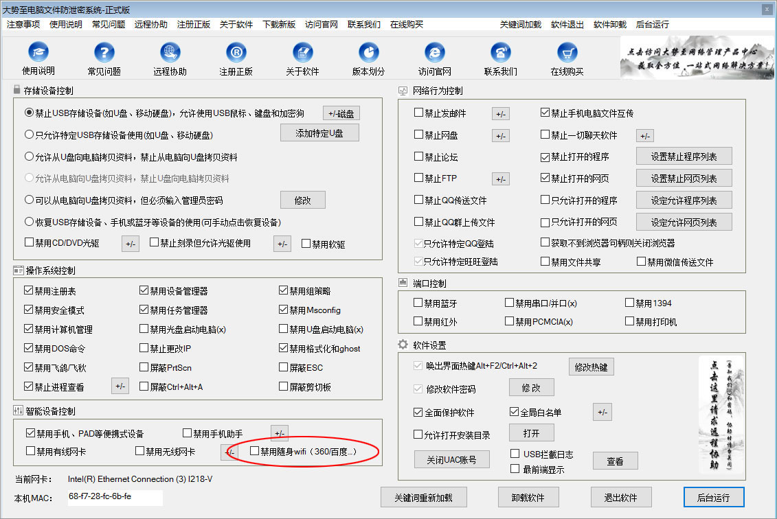 10)可以为用户进行个性化定制,随时禁止各种电脑设备、禁止修改操作系统任何配置,全力保护电脑安全和商业机密。