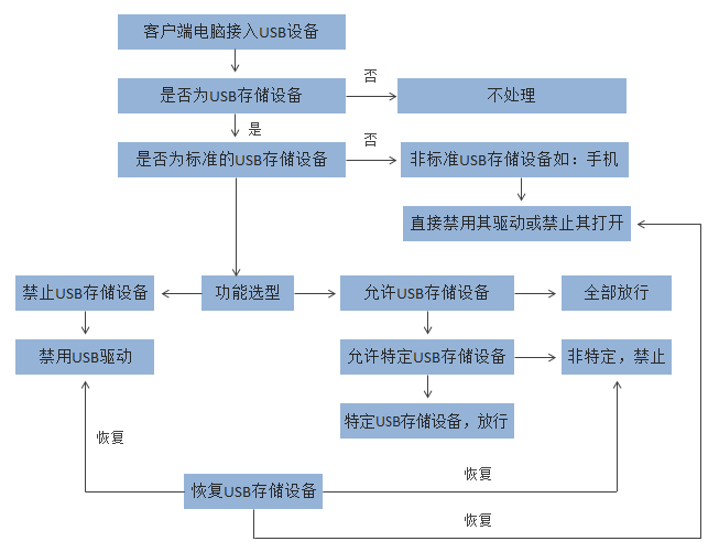 一、USB存储设备控制原理大势至电脑文件防泄密系统基于USB 存储协议在Windows系统底层对存储设备进行读写控制,可自动识别USB存储设备类型。一旦USB存储设备插入到安装客户端的计算机中,客户端通过设备标识或者设备的序列号识别USB存储设备,按照已设定的存储设备控制策略的权限类型对USB存储设备进行读写控制,标准的USB存储设备(如U盘,移动硬盘等)可以设置成四个权限“禁用”、“只读”、“只写”、“放行”,以及只允许特定USB存储设备使用,向USB存储设备复制文件必须输入密码等。