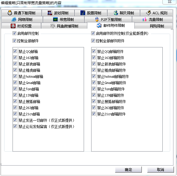 为了保护企业的商业机密,防止员工通过网盘、电子邮件等泄露出去,聚生网管系统还集成了对国内所有主流的网盘、电子邮件的控制,可以完全禁止所有网盘和所有邮件的使用。如下图所示:
