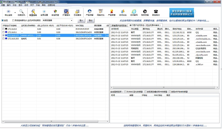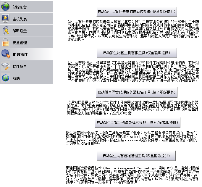 总之,聚生网管系统与诸多扩展插件功能可以相互协作,实现全方位的网络管理。聚生网管系统启动后可以有效制止局域网内员工不合理的上网行为,使得员工企图通过代理上网来逃避监控,则聚生网管系统一方面可以禁止其代理上网,另一方面通过代理扫描工具可以检测出安装代理软件、充当代理服务器的电脑,从而从根源上治理这种不合适的网络扩展行为;同时,通过启动外来电脑控制器,也可以将局域网充当代理服务器的电脑进行惩罚性的控制,将其隔离开局域网,使得内网电脑无法通过其代理上网;同时,通过网卡混杂模式检测工具可以检测出内网处于混杂模式的网卡,从而制止其网络抓包、网络侦听的行为,还可以检测出黑客工具或私自安装其他网管软件的行为,而一旦检测出这种异常的网卡通讯,则同样也可以利用外来电脑控制器将其完全隔离开内网,防止其危害整个局域网;同时,如果发现局域网某个电脑遭遇病毒、木马侵袭或发送网络风暴攻击,造成局域网大规模掉线、断网现象,也可以通过混杂模式检测工具将其检测出来,并应用外来电脑控制器将其隔离,切断其和局域网其他电脑的通讯,从而避免了危害的进一步扩大;同时,聚生网管系统将扫描到的网络主机可以共享给外来电脑控制器,将局域网主机放入外来电脑控制器的白名单中,除此之外的电脑一律都视为外来电脑而进行自动隔离;同时聚生网管的导出的主机列表也可以共享给远程开关机工具,从而实现对局域网电脑的批量关机操作;而主机异常警报工具即可以时刻监控内网服务器,一旦发现异常即向网管人员发送手机短信、邮件等方式及时通知,便于网管人员及时查验、修复。
