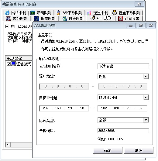 由于应用无穷无尽,尤其是一些具有地域性的小型应用,我们不可能全部穷举,对这些网络应用如果需要控制,我们提供了一个动态的ACL控制规则定义系统,对于具备一定网络知识的管理人员均可以使用。系统能够对定义好的ACL规则进行数据包分析,符号条件的通讯将被阻断。