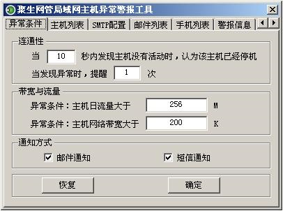 聚生网管局域网主机异常警报工具是大势至(北京)软件工程有限公司推出的一款针对局域网关键服务器、工作站或其他特殊主机的实时侦测工具。通过此警报工具,可以在被监控主机出现异常的情况下,通过邮件、手机短信(需短信设备支持)等方式迅速通知给管理员,便于管理员及时采取措施进行规避和修复,防止出现关键应用中断而无人响应的状态。聚生网管局域网主机异常警报工具作为聚生网管系统的第二个扩展插件,强化了聚生网管系统的网络行为监控功能,进一步深化了网络管理。