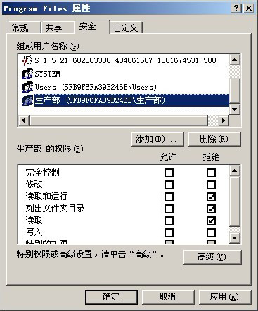禁止该组用户访问某个文件夹,可以右键单击该文件夹,打开“属性”对话框,选择“安全”选项卡,选择“添加/高级/立即查找”菜单,选中列表里的用户组“生产部”,然后一路点“确定”。这时,可以看到该文件夹的属性,组或用户名称列表里,已经出现了我们需要的“生产部”这个组(如图3所示)。