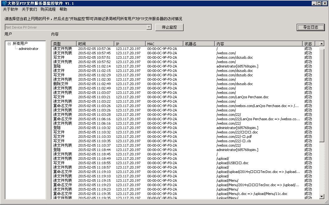 而对于FTP文件服务器,则由于FTP软件自身的权限较为单一,无法详细记录FTP文件服务器的上传和下载情况,也不能只允许FTP文件上传而禁止FTP文件下载;或者只让下载FTP文件而禁止上传FTP文件,这种情况也可以借助于“大势至FTP服务器管理软件”(下载地址:http://www.grablan.com/ftpjk.html)来实现。如下图所示: