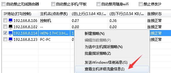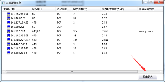 但是,怎么知道要例外访问的HTTPS网站的IP地址呢,可以利用“聚生网管”的“查看主机详细流量功能”。在要控制的电脑上右键点击,然后选择“查看主机详细流量信息”,然后再用这个被控制的电脑去访问想要例外放行的网站(需要先暂时停用ACL规则里面的“禁止HTTPS”规则,否则将无法访问),然后在被控制的电脑打开了想要例外访问的网站后,这个时候一般也就可以停止抓包了,然后就会看到所有抓取到的IP地址,这些IP地址通常就是访问例外网站所必须的(需要注意的是,在抓包时较好在被控制的电脑上不要再打开其他应用,防止误判)。然后点击“导出列表”将捕获到的IP地址导出来,加入到到“全局白名单”就可以了。如下图所示: