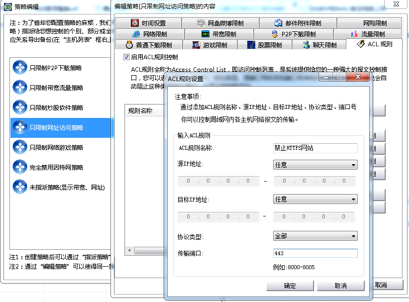 首先,通过“聚生网管”创建一个管理用户上网的策略,如果想要完全禁止访问HTTPS网站,则只需要在聚生网管的“策略配置”这里,点击“ACL访问规则”,然后创建一个禁止443端口的ACL规则即可。这是因为,所有的HTTPS网站访问都是通过443端口进行。因此,一旦过滤443端口的数据报文,将会完全禁止访问一切HTTPS的网站。如下图所示: