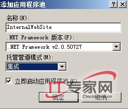 以管理员(administrator)身份登录Web服务器,然后依次点击在“开始”→“管理工具”→“Internet信息服务(IIS)管理器”打开IIS 7管理器窗口。在“Internet信息服务(IIS)管理器”的左侧展开“Web”(服务器名),然后点击“应用程序池”,在“操作”面板,点击“添加应用程序池”,在“添加应用程序池”对话框中“名称”中输入“InternalWebSite“,然后点击“确定”退出。(图1)