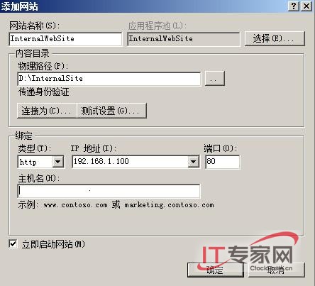 在“Internet信息服务(IIS)管理器”中展开“站点”,然后点击“Default Web Site”,右击“Default Web Site”,然后点击“删除”。在“确认删除”对话框,点击“是”。接下来,继续在“Internet信息服务(IIS)管理器”中点击“网站”,然后在操作菜单中点击“添加网站”,使用下列设置完成“添加网站”对话框,当输入完成后点击“确定”。其中“站点名称”为“InternalWebSite”,“物理路径”为“D:\InternalSite”,“绑定”为“默认值”。在动作面板中,点击“浏览 *:80 (http)”可打开Internet Explorer进行站点的解析,如果解析正确,说明配置成功,较后关闭IE浏览器即可。(图2)