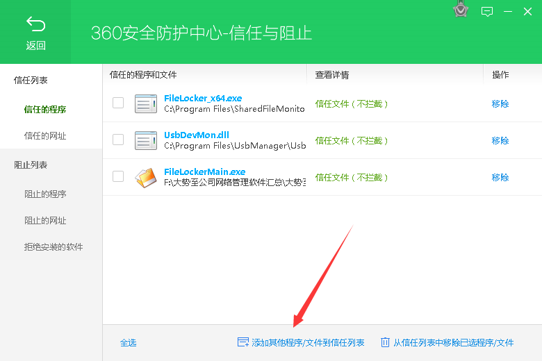 当然,您也可以手动将大势至电脑文件防泄密系统加入到360安全卫士的“信任”白名单(尤其是安装了360安全卫士企业版的用户,可以通过管理端向局域网客户端一次性批量推动)。方法如下: