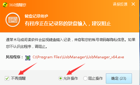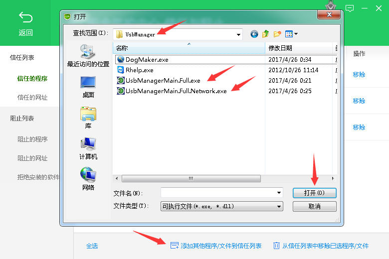 可以找到软件的默认安装路径(D:\Program Files\UsbManager),然后双机里面的“UsbManagerMain.Full.Network.exe”或“UsbManagerMain.Full.exe”就可以了。如果在双击的过程中,360安全卫士依然还是提示拦截,则一定要选择“全部放行”,并勾选“不再提醒”。