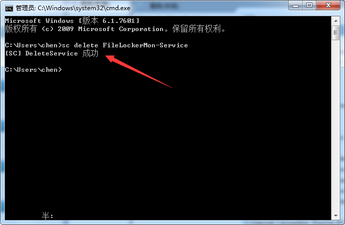 然后,再点击“开始”-“cmd”,回车,进入dos命令下面,输入sc delete FileLockerMon-Service 回车,然后提示删除成功,再运行客户端就可以了。如下图所示: