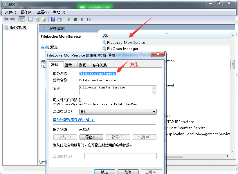 点击-开始-控制面板-管理工具-服务,然后找到FileLockerMon-Service,如下图所示: