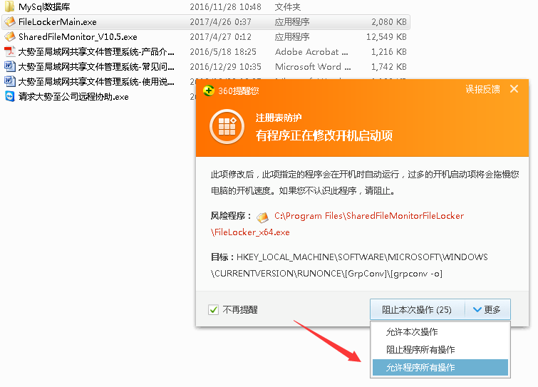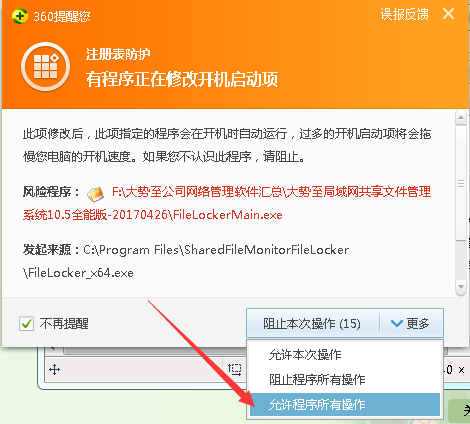 此外,由于很多用户电脑都安装了360安全卫士,因此在运行FileLockerMain.exe客户端的时候会提示拦截。此时,必须点击“全部放行”并勾选“不再提醒”,否则如果被360安全卫士拦截了,导致客户端FileLockerMain.exe无法正常启动,并可能提示“启动监控失败”,就会导致用户无法访问共享文件了。如下图所示: