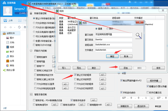 点击“禁止打开的程序”,然后点击“添加”,然后拖动放大镜图标到网盘的客户端上,程序就会自动读取到网盘的相关特征,然后点击“确定”,并点击“保存”,即可成功禁止了百度网盘的客户端,此时如果打开了百度网盘客户端,则程序就实时将其关闭。如下图所示:
