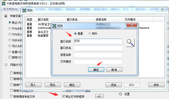 方法与禁止客户端相同,点击“禁止打开的程序”,然后点击“添加”,然后在窗口哪里输入“打开”,点击“确定”,并点击“保存”即可。如下图所示:
