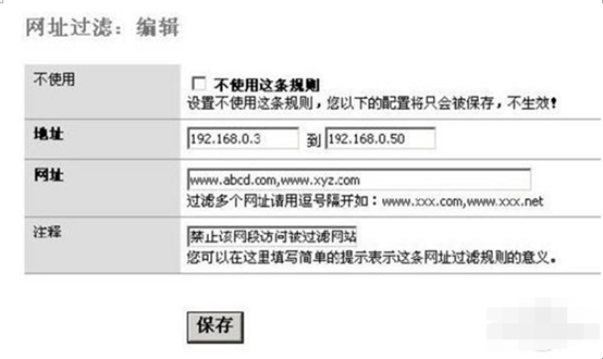 针对网址过滤则在路由器的“域名过滤”,这里添加网址即可。如下图所示: