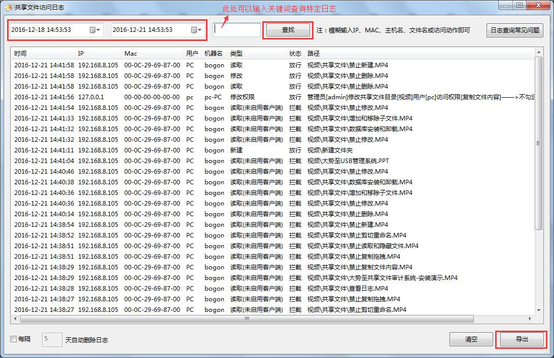 查询日志的步骤可分三步:首先选择查询时间,然后输入关键词(例如IP地址、MAC地址、用户名、主机名、文件名、操作类型等,也可不输入则代表查询所有日志),较后点击“查找”就可以查看日志了。还可以点击“导出”将日志导出为Excel表格,以供用户备份,如下图所示。