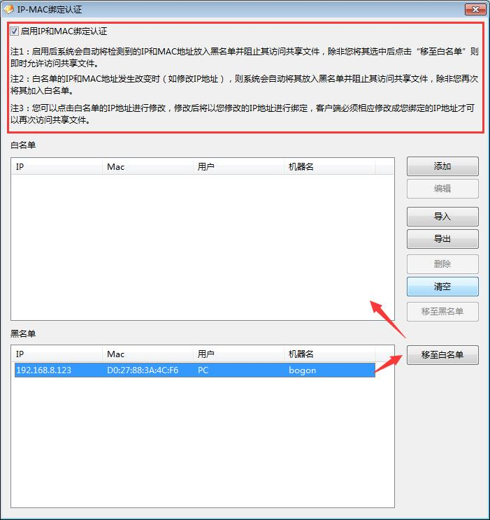 此项功能主要用来对用户访问共享文件时进行IP地址、MAC地址、用户名、机器名绑定认证,也就是只有加入白名单内,符合绑定规则的用户才可以正常访问共享文件,否则将予以拒绝,如下图所示。