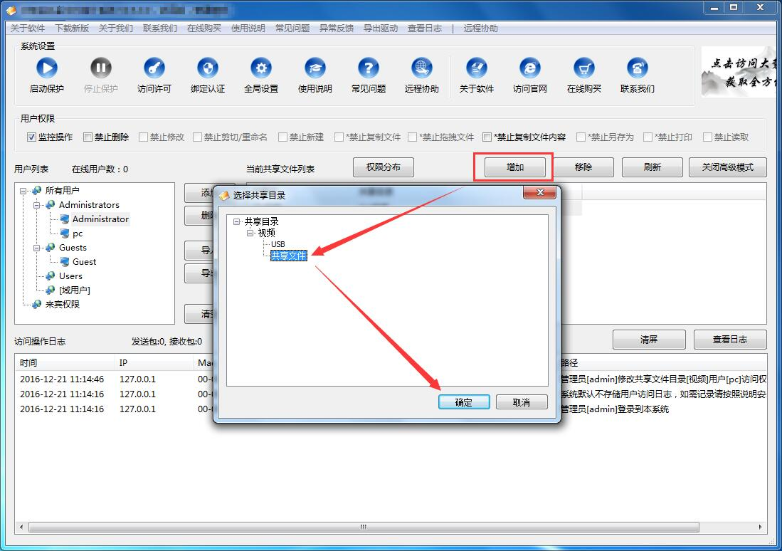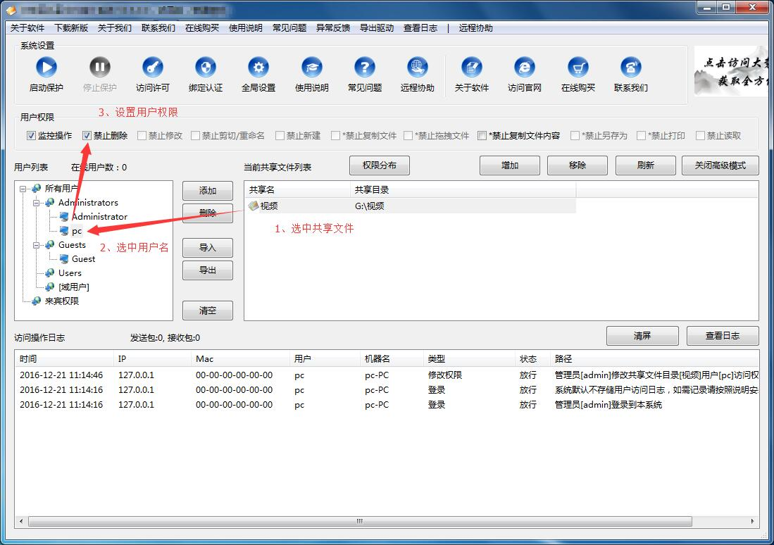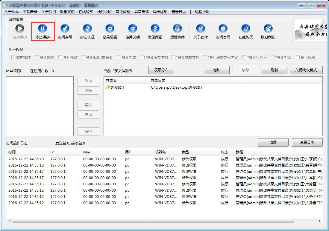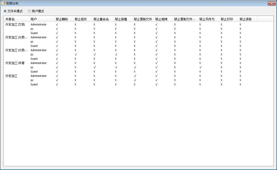 大势至文件共享管理系统、企业共享权限设置软件(下载地址:http://www.grablan.com/gongxiangwenjianshenji.html),只需要安装在共享文件服务器上,就可以自动扫描到当前服务器所有共享文件夹,以及服务器上所有账户,然后就可以为共享文件设置不同用户的不同访问权限,可以实现共享文件只让读取禁止复制、共享文件只让修改禁止删除、共享文件只让打开禁止拷贝、禁止共享文件另存为本地磁盘以及拖拽共享文件、打印共享文件的行为,保护了服务器共享文件的安全。同时,本系统还可以详细记录共享文件访问日志,便于管理员事后备查和审计。