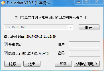 4、当勾选“禁止复制文件”“禁止拖拽文件”“禁止复制文件内容”“禁止另存为”“禁止打印”这几项用户权限时,软件会启用高级模式,访问者在访问共享文件前需要先运行客户端FileLockerMain,运行后默认隐藏,按组合键alt+F5,输入密码(默认是dszdsz)可以进入客户端,首次使用需要输入服务器的IP地址,然后点击“连接”,当较后更新时间显示为当前时间时表示成功连接,如下图所示。在高级模式下,如果退出客户端,将无法访问共享文件。