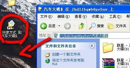 我们可以用鼠标左键点住地址栏,按紧,拖到到桌面上,我们看到桌面多了一个汽车大碟的快捷方式。下次我们可以直接用这个快捷方式访问该共享。