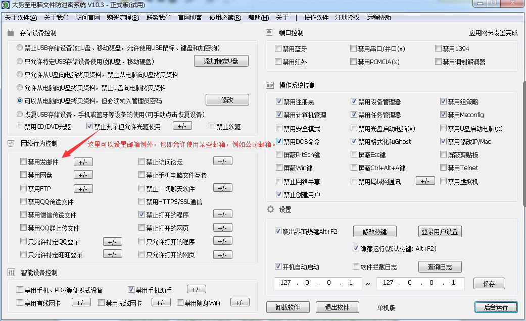 对于邮件管控,虽然有些信息安全产品可以过滤邮件内容或者检测邮件附件,但是一旦邮件发送者将电脑文件用Winrar加密并且设置密码,则信息安全产品就无法识别和过滤了。因此,比较有效的办法是,禁止电脑发送邮件、禁止邮件附件发送,或者只让使用公司邮箱、只让使用指定的邮箱发送邮件。目前,大势至电脑文件防泄密系统,依然可以实现禁止电脑发送邮件、只让使用特定邮箱发送邮件的功能。如下图所示: