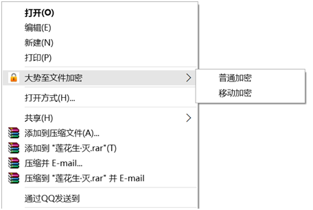 此外,系统也自动加入到鼠标右键菜单,你可以在要加密的文件上右键点击“加密”,选择相应的加密类型,即可快速加密文件而无需登录到软件界面进行操作。如下图所示: