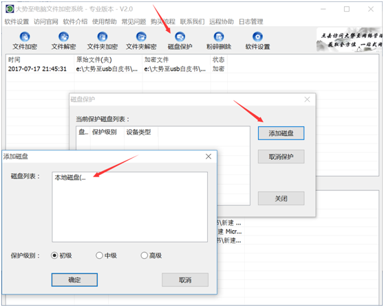“磁盘保护”的操作也极为简单:点击“磁盘保护”,然后点击“添加磁盘”,然后系统会列出电脑当前所有的磁盘列表,选择要保护的磁盘,并勾选相应的保护级别。如下图所示: