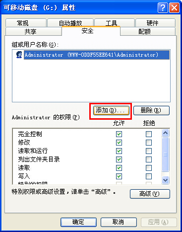 3.重新使用鼠标右击u盘选择"属性",在“安全”选项栏中点击“添加”按钮,如下图所示: