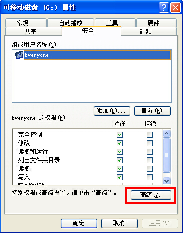 1.使用鼠标右击u盘选择“属性”,在打开的属性窗口中我们将界面切换到“安全选项”,然后点击下方的高级按钮,如下图所示: