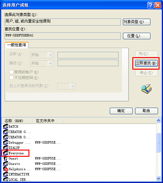 4.在弹出的选择用户或组窗口中依次点击“高级—立即查找”,当查找后我们在下方中找到“Everyone”,选中它,然后点击“确定”按钮即可,如下图所示: