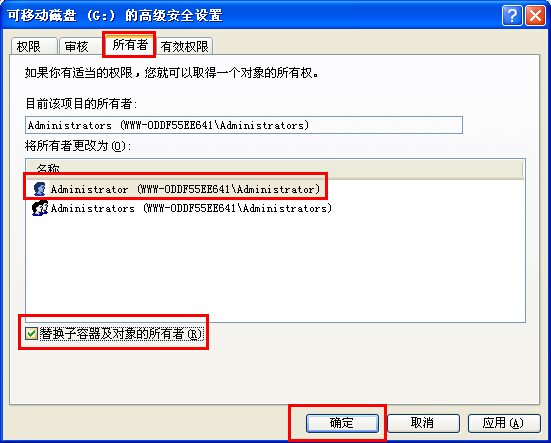 2.在弹出的高级设置窗口中将界面切换至“所有者”选项栏,选择一个用户然后勾选“替换子容器及对象的所有者”,点击“确定”即可,如下图所示: