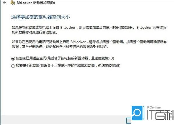 两个选择,仅加密已用磁盘空间或者加密整个驱动器,一般选择加密磁盘空间。