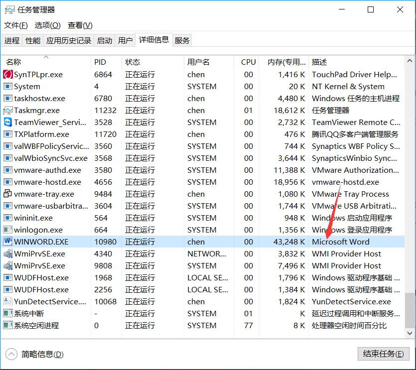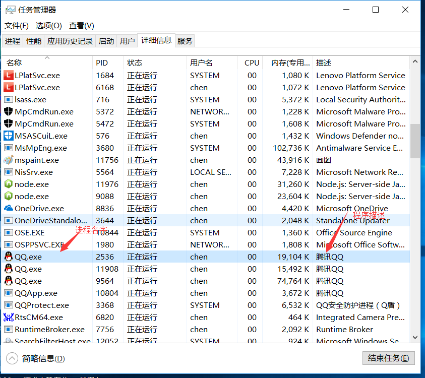 当然,我们也可以直接在“任务管理器”里面查看程序的进程名和文件描述。如下图所示: