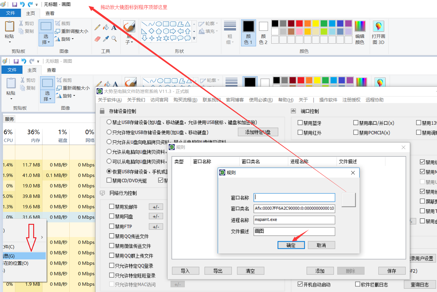此外,还有一些程序是子窗口,没有进程名字或者描述,那么这个时候我们可以通过窗口名或者类名来设置(需要拖动放大镜图标),如下图所示: