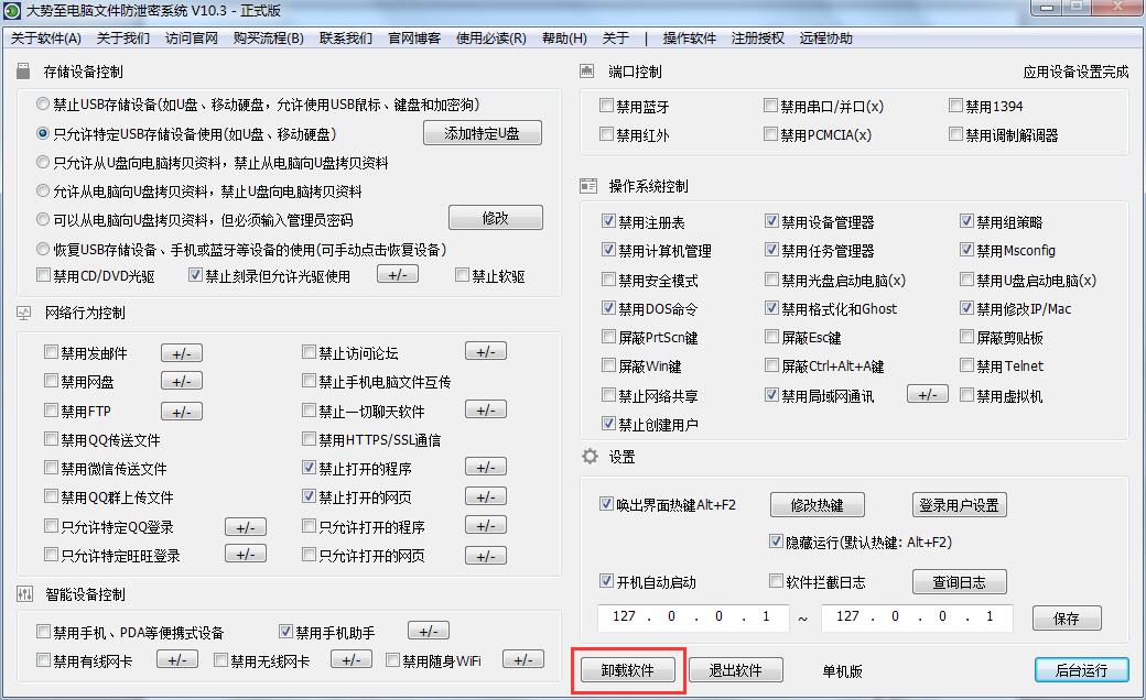 禁止电脑连接U盘、移动硬盘等,只需勾选“禁止USB存储设备”,立即生效。