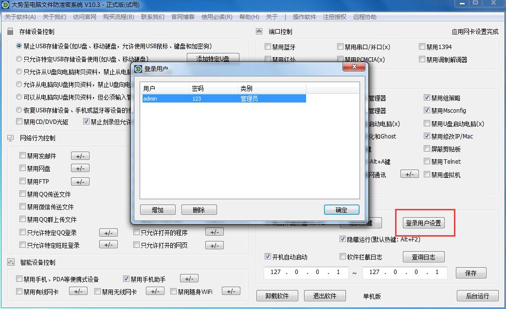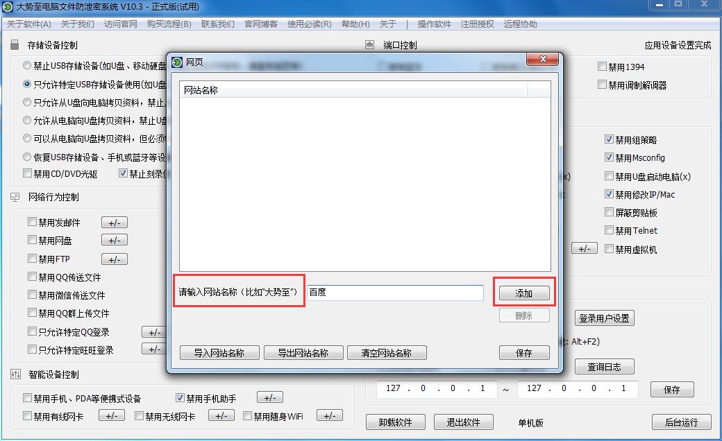 插上U盘,勾选“只允许特定USB存储设备使用”,点击“添加特定U盘”,在弹出的窗口中将左侧序列号选中(插上U盘后自动显示),添加至右侧列表,然后保存。设置完成后,这台电脑就只能识别许可列表中的U盘,其它U盘插入电脑后则不显示。U盘列表可以批量导入或导出。勾选“只让读取白名单的USB存储设备”表示这些许可的U盘只允许读取,禁止写入。