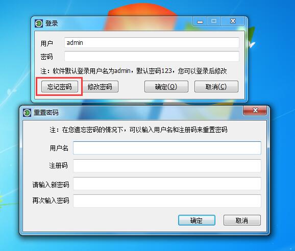 如果忘记密码,可以点击“忘记密码”,输入“注册码”即可设置新密码。