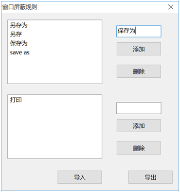 “软件设置”,则主要是设置软件的运行、账号、加密文件后的操作以及屏蔽窗口等。其中“屏蔽窗口设置”主要是可以让管理员自行设置要屏蔽的应用程序窗口,以此实现个性化、可扩展的用户访问加密文件的动作控制,操作也极为简单,点击“增加”,然后输入名称即可。如下图所示:
