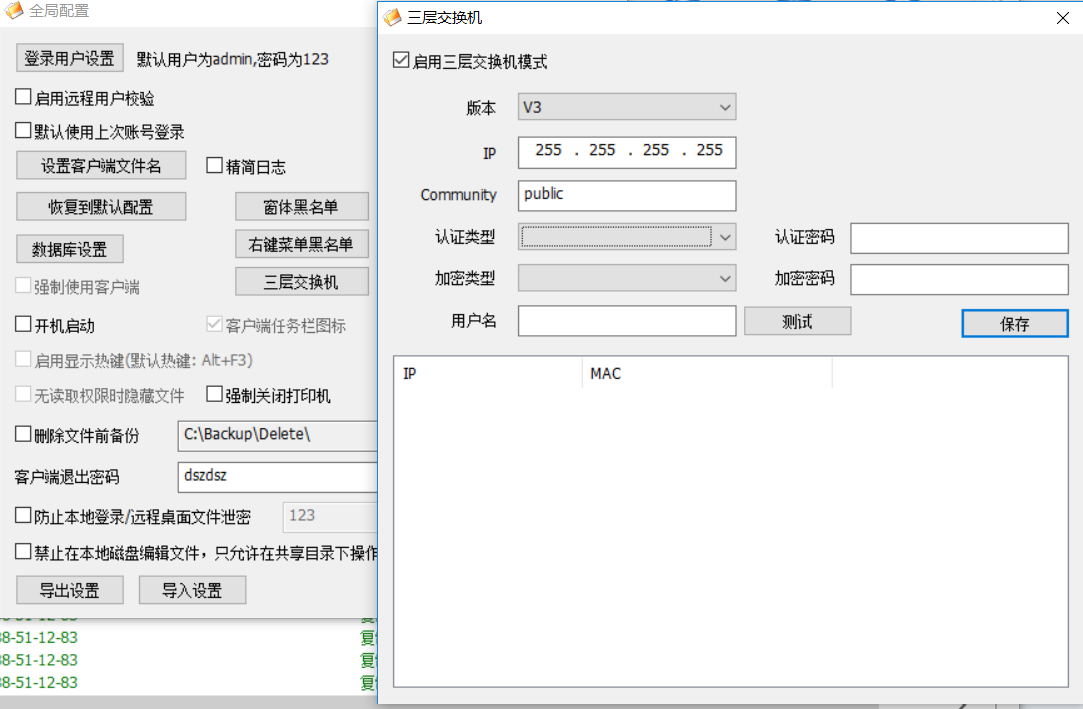 “三层交换机设置”。这里针对用户是三层交换机划分了多个网段的环境,并且访问的用户和文件服务器不是同一个网段的情况下,为了能够识别访问者的IP和MAC地址等信息而需要配置三层交换机。如下图所示: